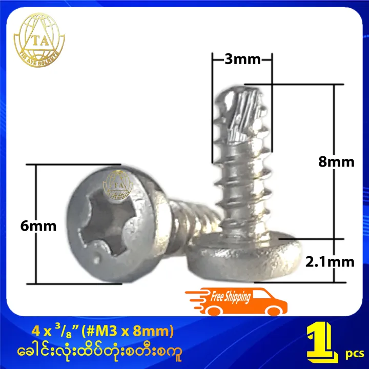 4 x ⅜" (#M3 x 8mm) ခေါင်းလုံးထိပ်တုံး စတီးစကူ Stainless Steel Cross Recessed Phillips Pan Head Dog Point Screw (Stock Limited)